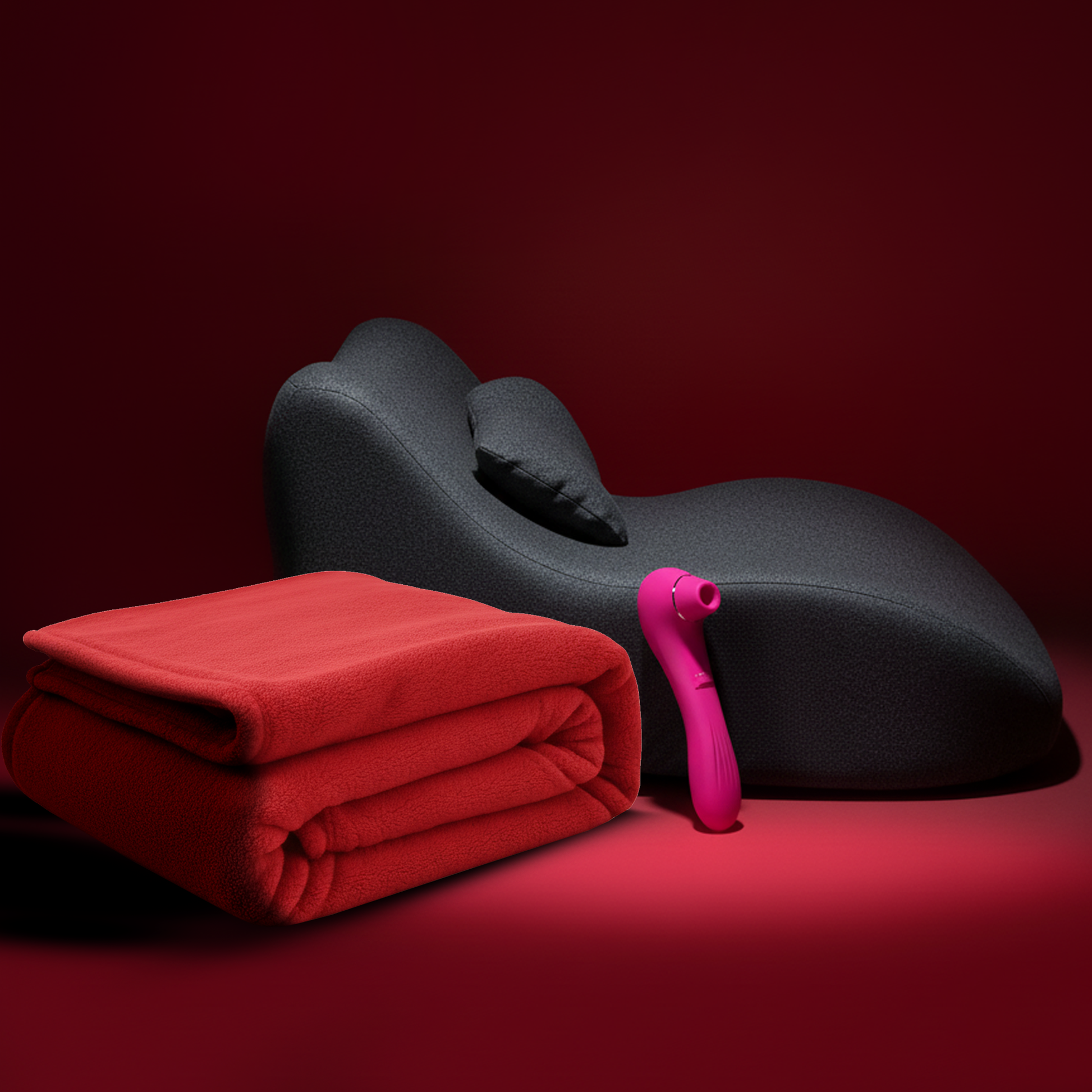 The Moodie Intimacy Comfort Pillow (27-degree memory foam positioning pillow with velvet cover), The Moodie Wellness Device (dual-action air-pulse massager), and The Waterproof Intimacy Blanket.